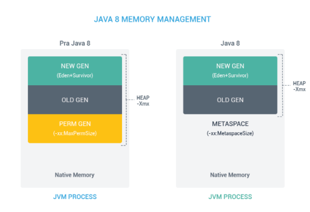 - PermGenArea 제거 : java8이전에는 초기 설정시 PermSize, MaxPerSize를 성정해야 했는데 이후 MetaSpace로 변경됐다. MetaSpace는 런타임 시 메모리 요규 사항에 따라 자체 크기를 조정하며, 필요하다면 MaxMetaspaceSize 매개변수를 조정하여 양을 조정할 수 있다.