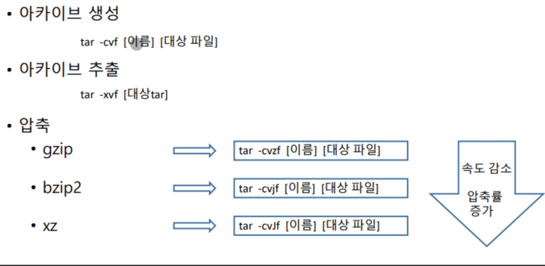 | gzip | .tar.gz | .tgz | zip과 같은 압축 알고리즘을 사용하지만 더 용량이 작음.(다른 파일끼리의 중복되는 부분을 하나로 압축이 가능하기 때문) |
